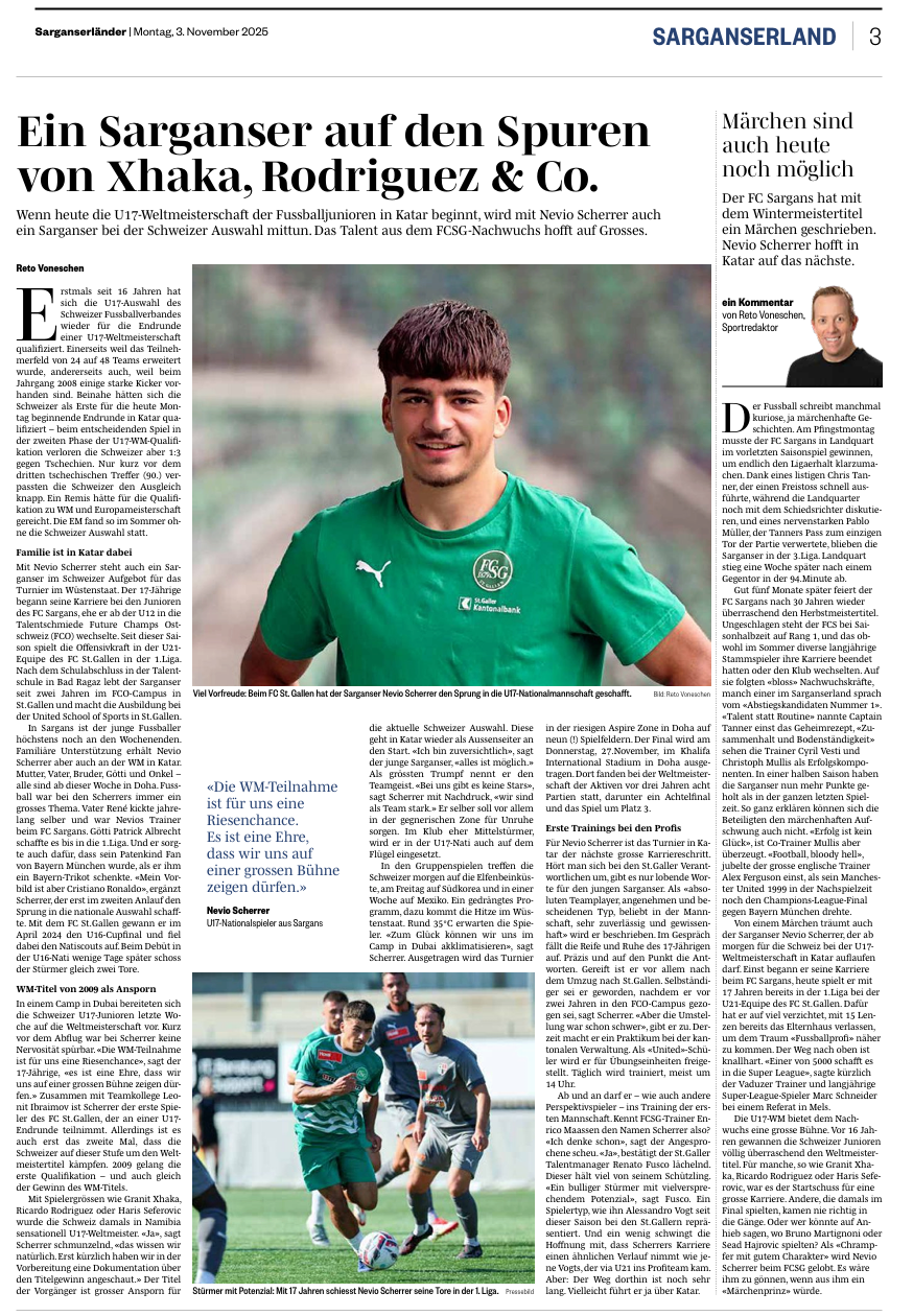 Der 17-jährige Nevio Scherrer vom FCO Sargans steht mit der Schweizer U17-Nationalmannschaft an der Weltmeisterschaft in Katar im Einsatz. Der Offensivspieler aus dem Nachwuchs des FC St. Gallen hat sich mit starken Leistungen für das WM-Kader empfohlen. Für Scherrer geht mit der Teilnahme ein grosser Traum in Erfüllung, er hofft, auf der internationalen Bühne wertvolle Erfahrungen für seine weitere Karriere zu sammeln.