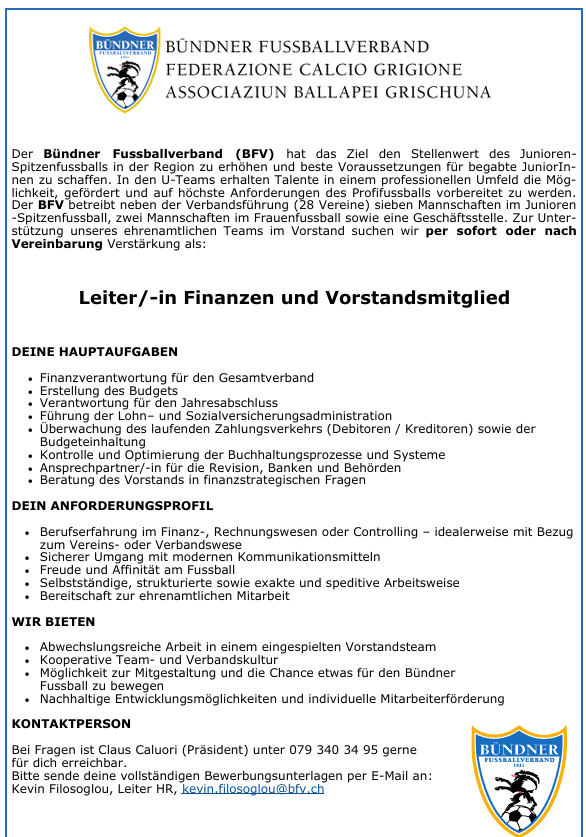 Der Bündner Fussballverband sucht per sofort oder nach Vereinbarung Verstärkung als „Leiter*in Finanzen und Vorstandsmitglied“.
